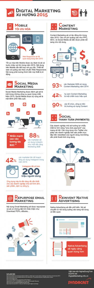 Social Media Marketing sẽ đóng vài trò rất quan trọng về digital marketing trong năm 2015. Nó được dự kiến sẽ được sử dụng như một nền tảng phân phối nội dung vững chắc và hiệu quả. Cụ thể, có một số liệu thống kê cho chúng ta thấy là, 88% các nhà tiếp thị sử dụng LinkedIn như là một nơi đêt tiếp thị B2B. Và hiện nay, Instagram đã có hơn 200 triệu người sử dụng, và ứng dụng của nó là một công cụ hữu ích để chia sẻ hình ảnh doanh nghiệp. Ngoài ra, các doanh nghiệp vừa và nhỏ sẽ rất có lợi từ việc “one click payment” của các mạng xã hội. Các ứng dụng như Twitter cho phép các doanh nghiệp bán sản phẩm trực tiếp thông qua newsfeed của người dùng mà không cần rời khỏi ứng dụng.